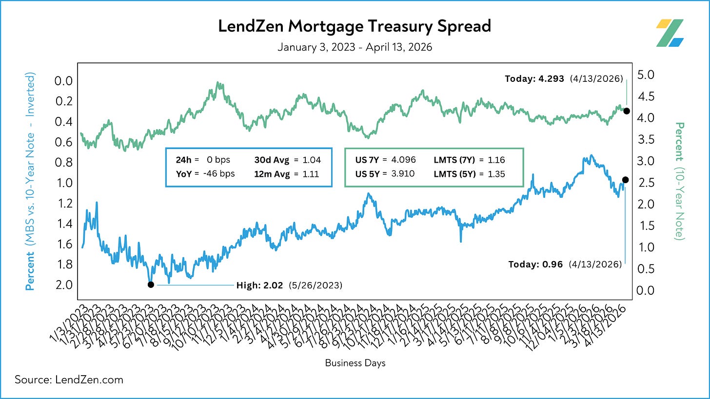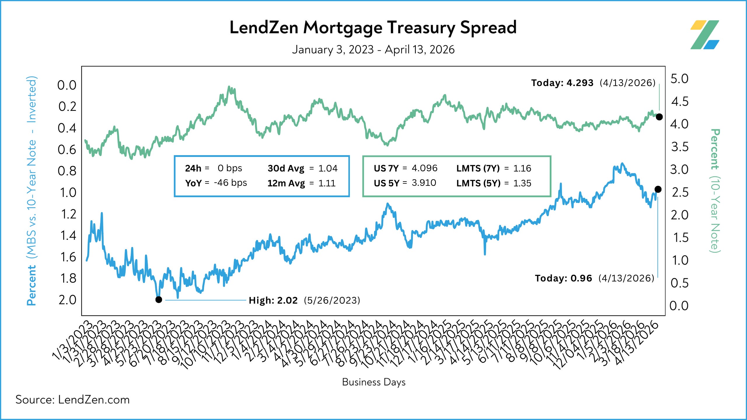 The LendZen Mortgage Treasury Spread (LMTS) uses actual bond yields to create a historically consistent, and reliable, data set.