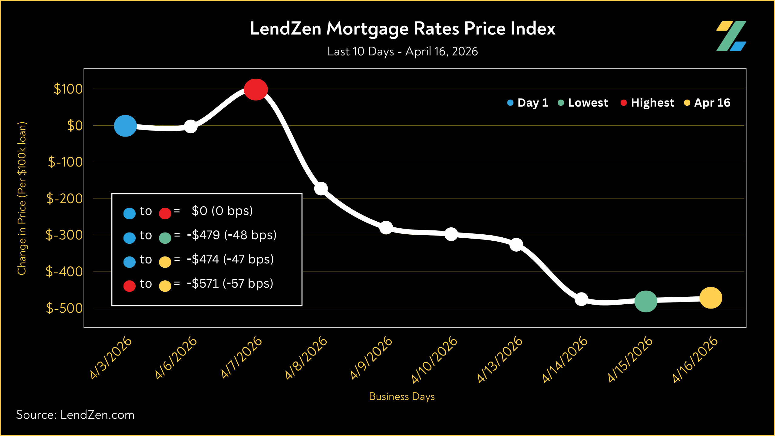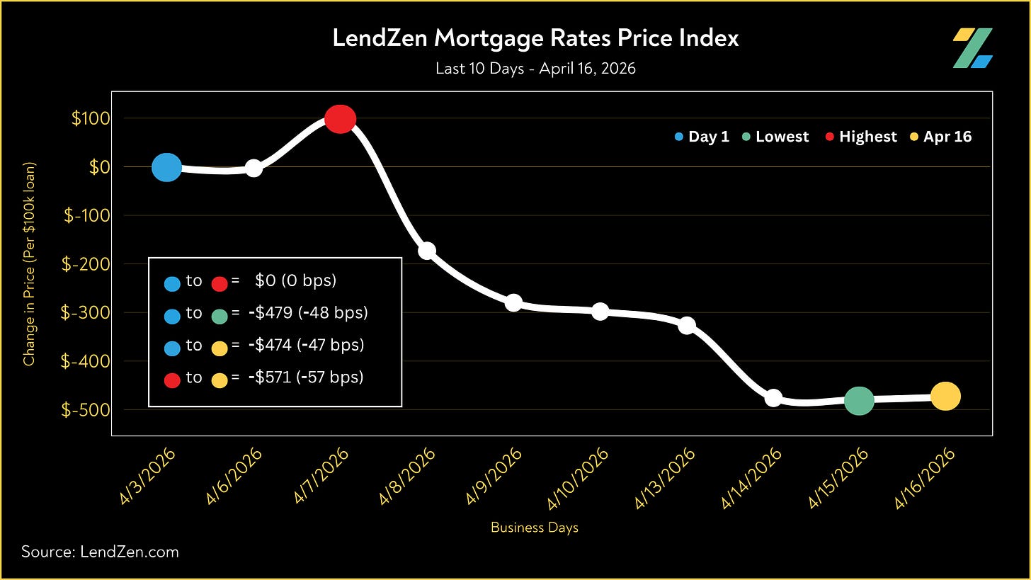 Since April 3, the price of mortgage rates decreased 47 basis points, as seen in the 10-Day chart below.