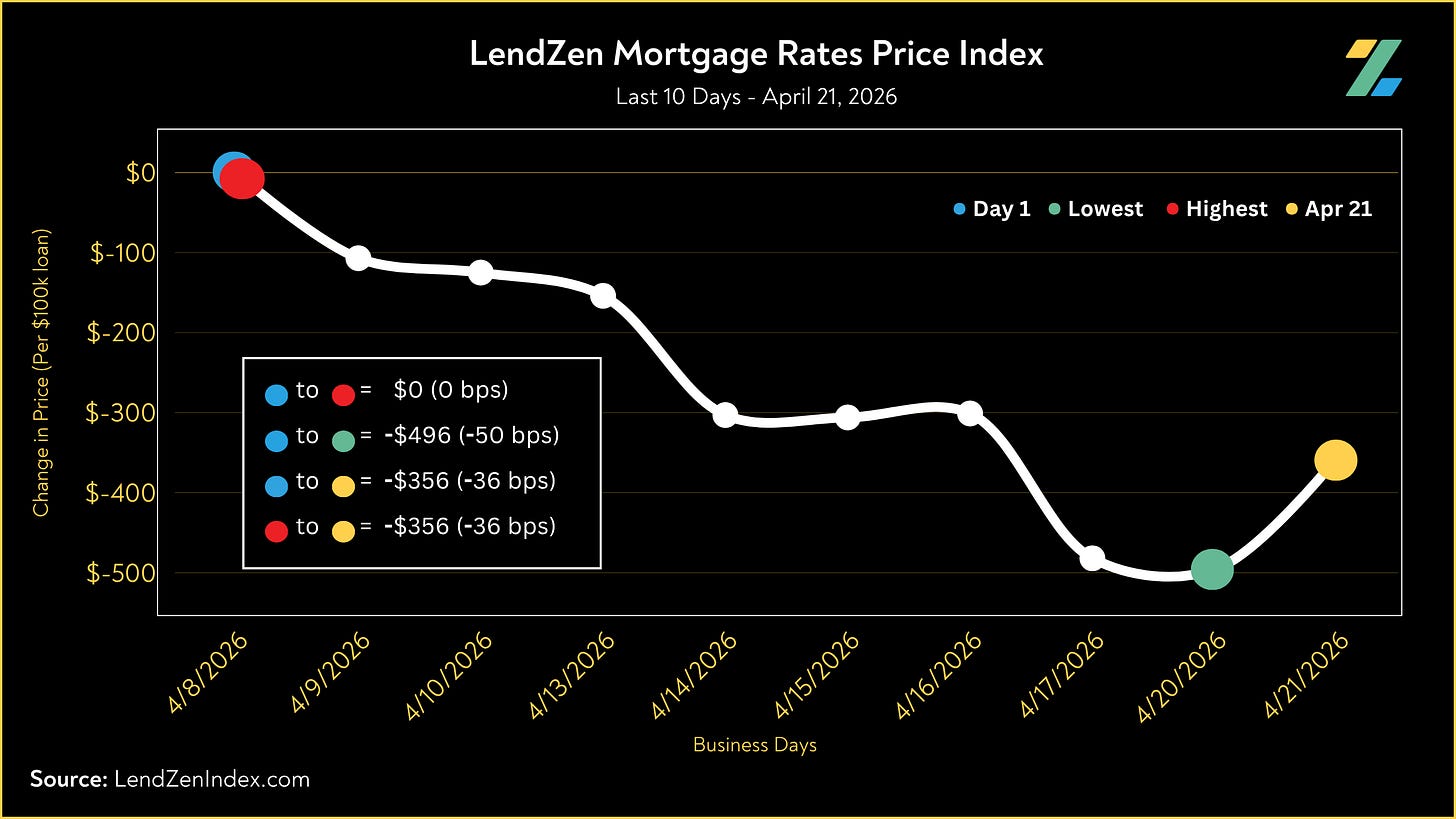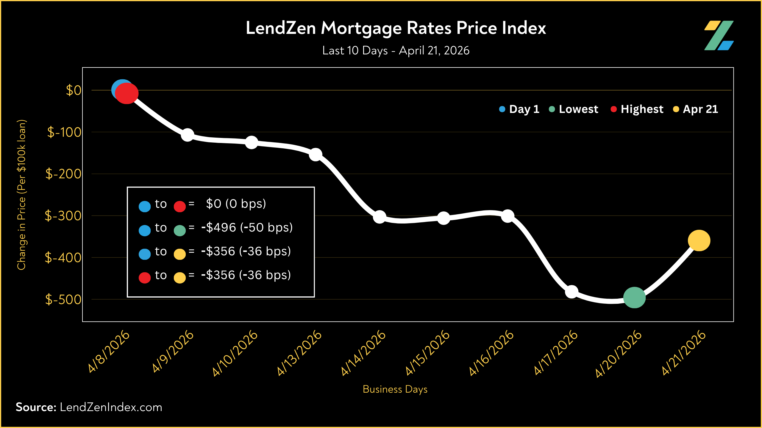 Since April 8, the price of mortgage rates decreased 36 basis points, as seen in the 10-Day chart below.