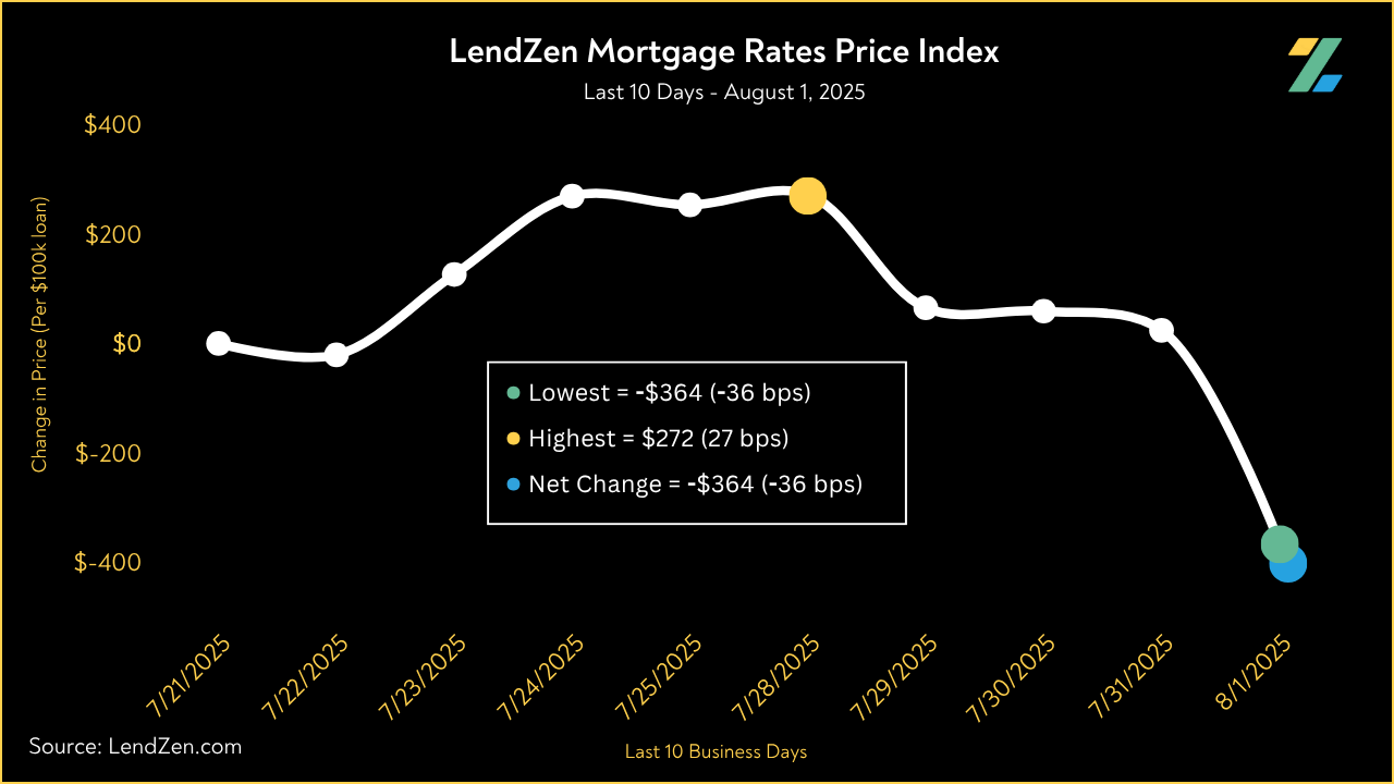 Since July 21, the price of mortgage rates decreased 36 basis points, as seen in the 10-Day chart below.