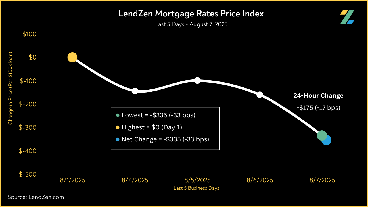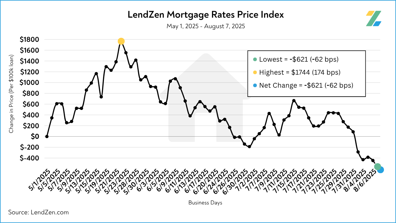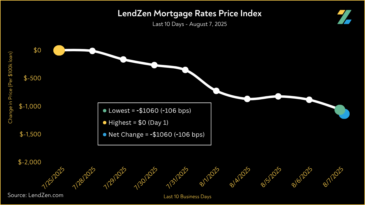 Since July 25, the price of mortgage rates decreased 106 basis points, as seen in the 10-Day chart below.
