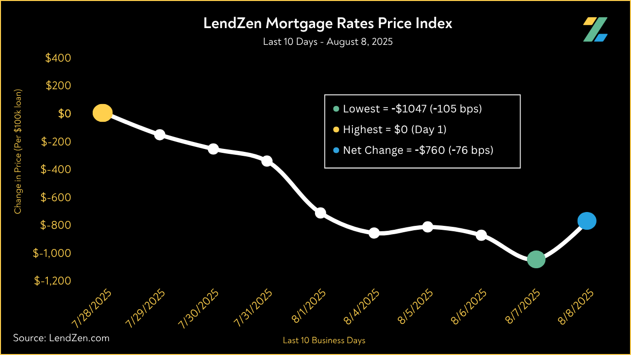 Since July 28, the price of mortgage rates decreased 76 basis points, as seen in the 10-Day chart below.