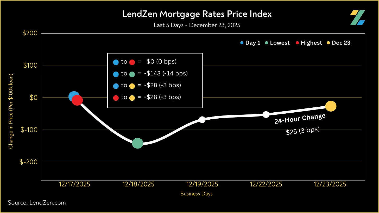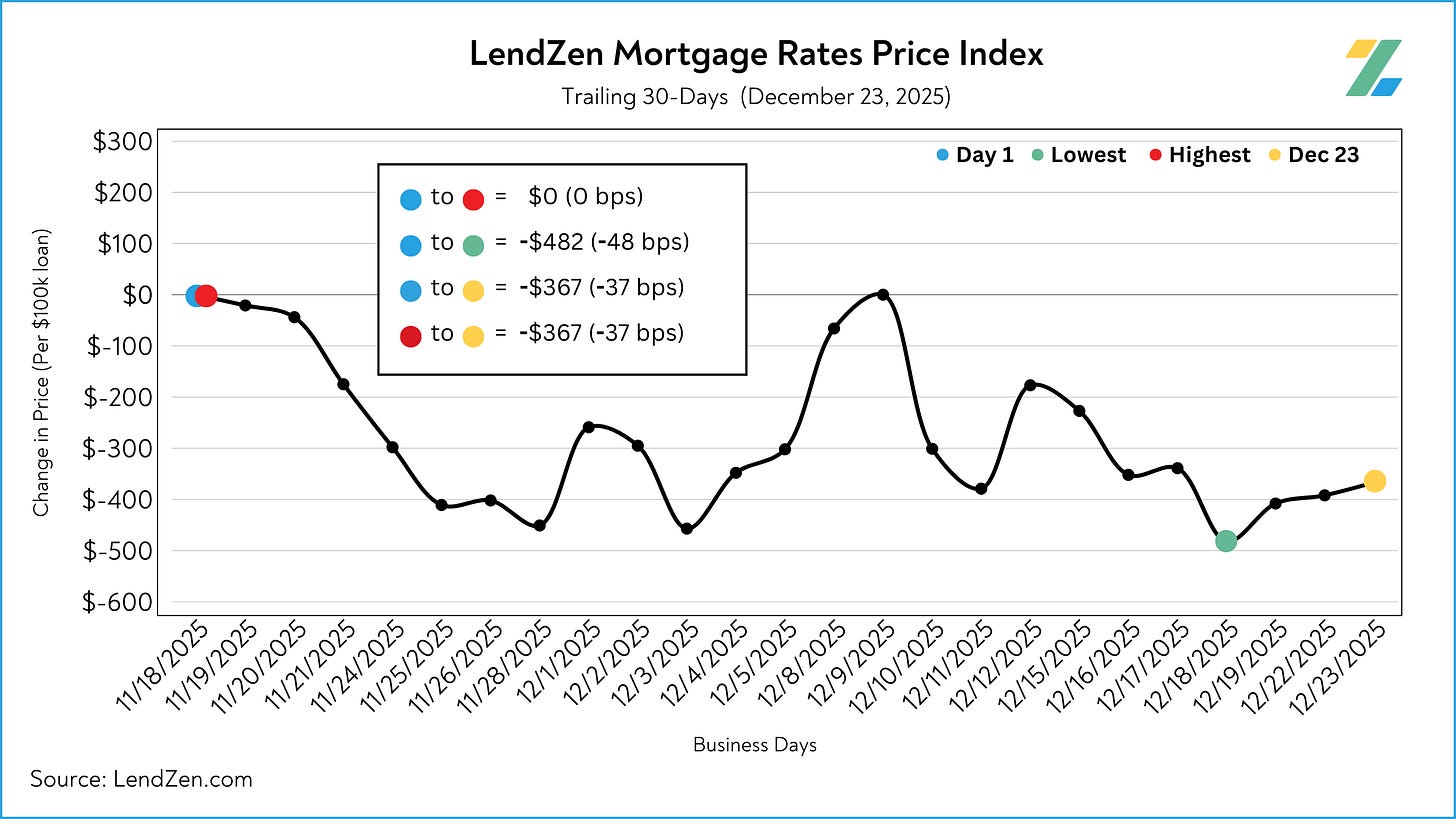 Since December 10, the price of mortgage rates decreased 7 basis points, as seen in the 10-Day chart below.