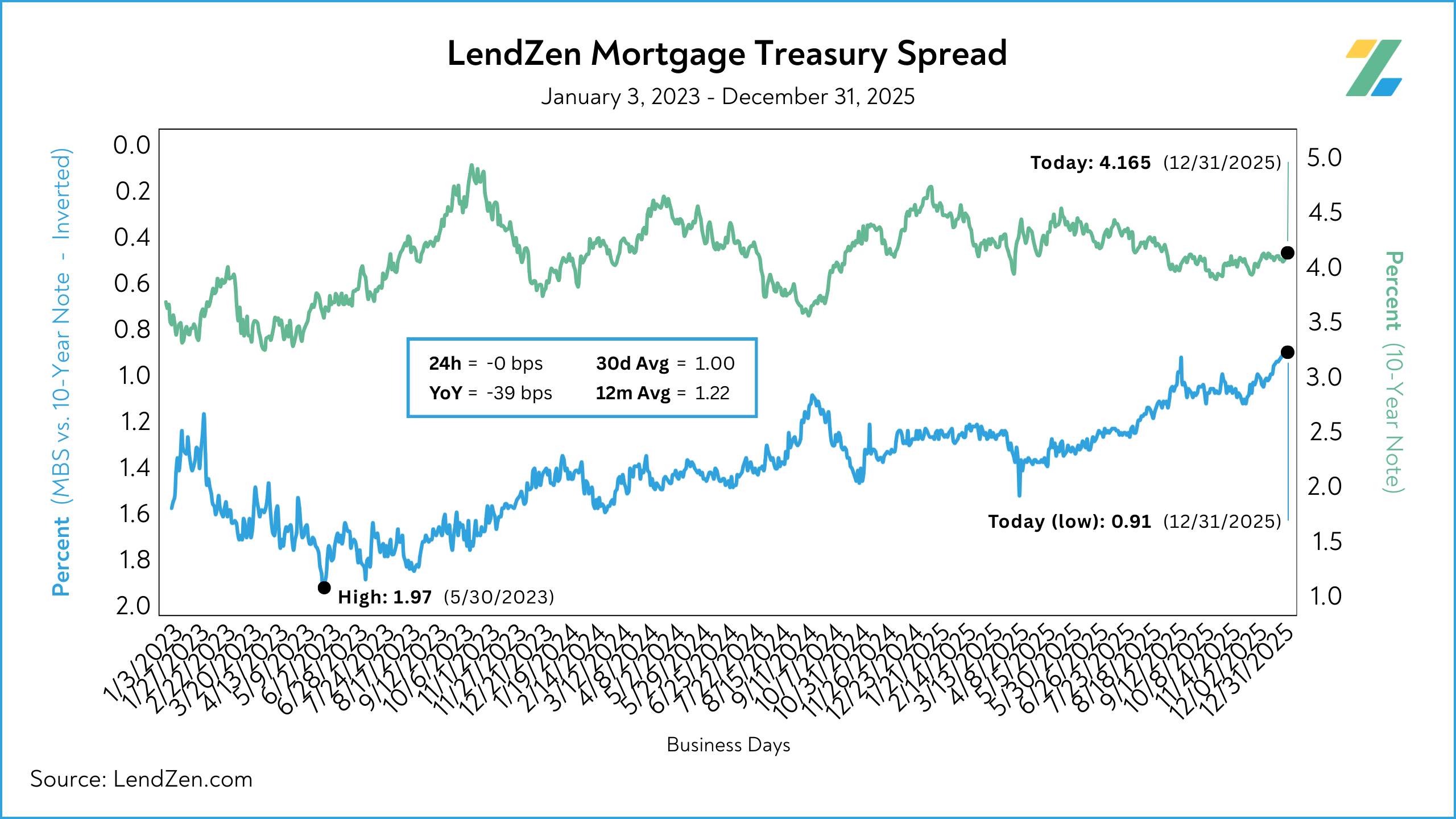 The LendZen Mortgage Treasury Spread (LMTS) uses actual bond yields to create a historically consistent, and reliable, data set.