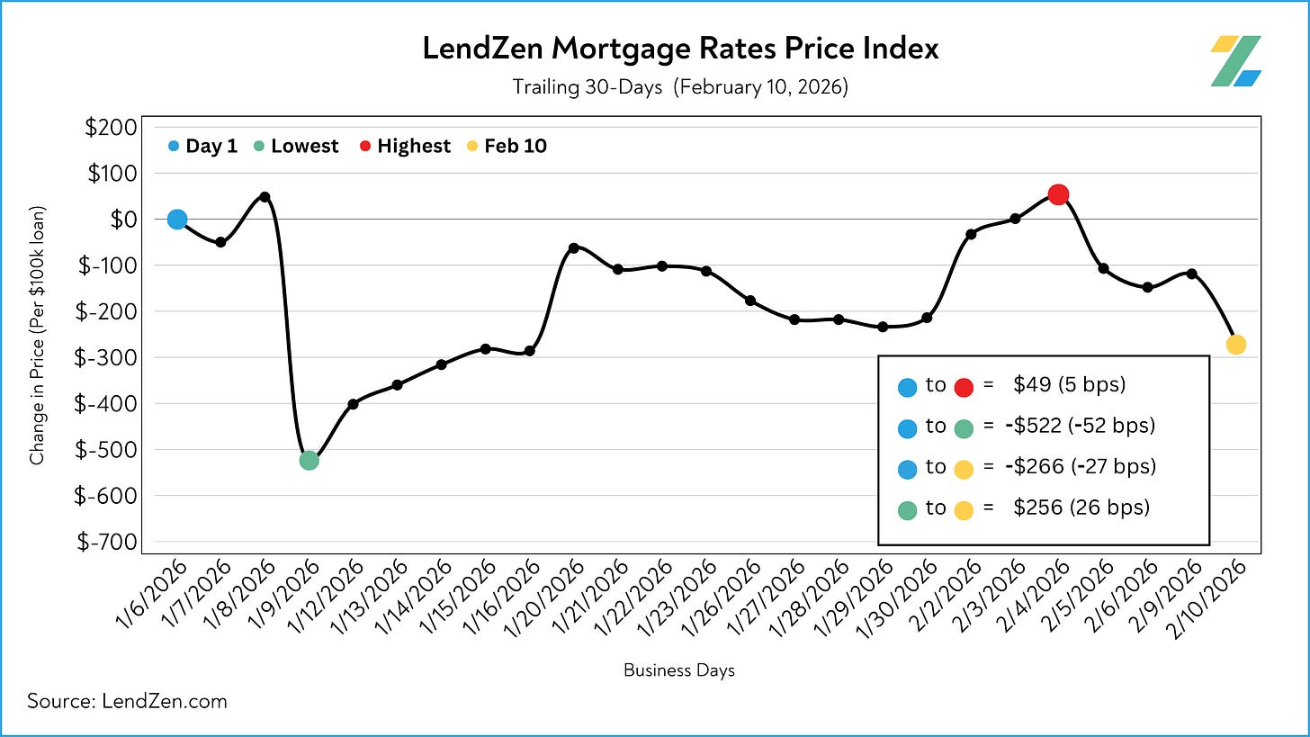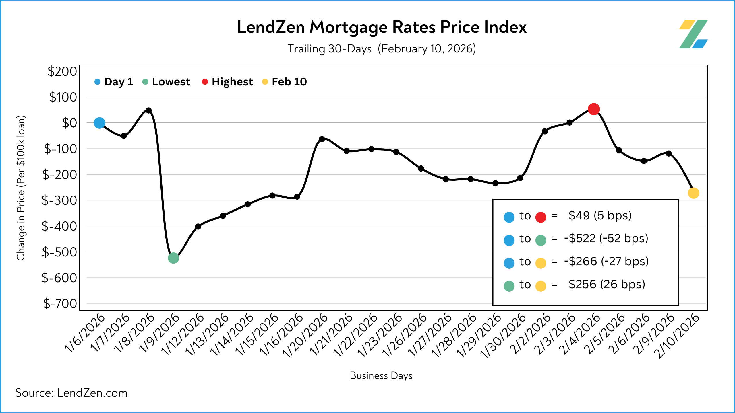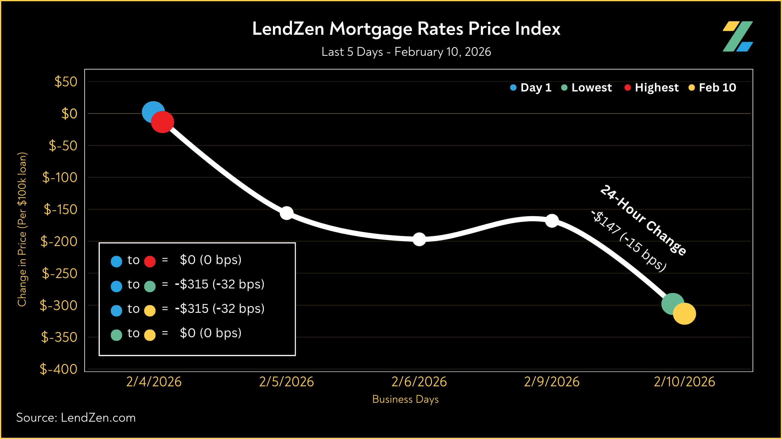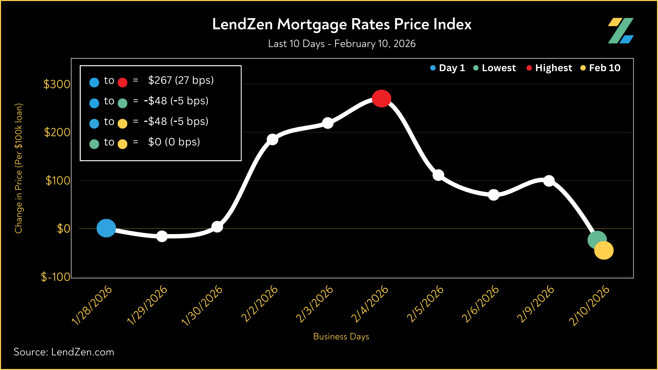 Since January 28, the price of mortgage rates decreased 5 basis points, as seen in the 10-Day chart below.