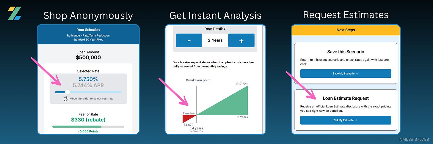 LendZen.com (NMLS# 375788) provides a fully automated mortgage shopping experience that gives you anonymous access to all mortgage rates with full transparency of costs upfront as bond prices change.