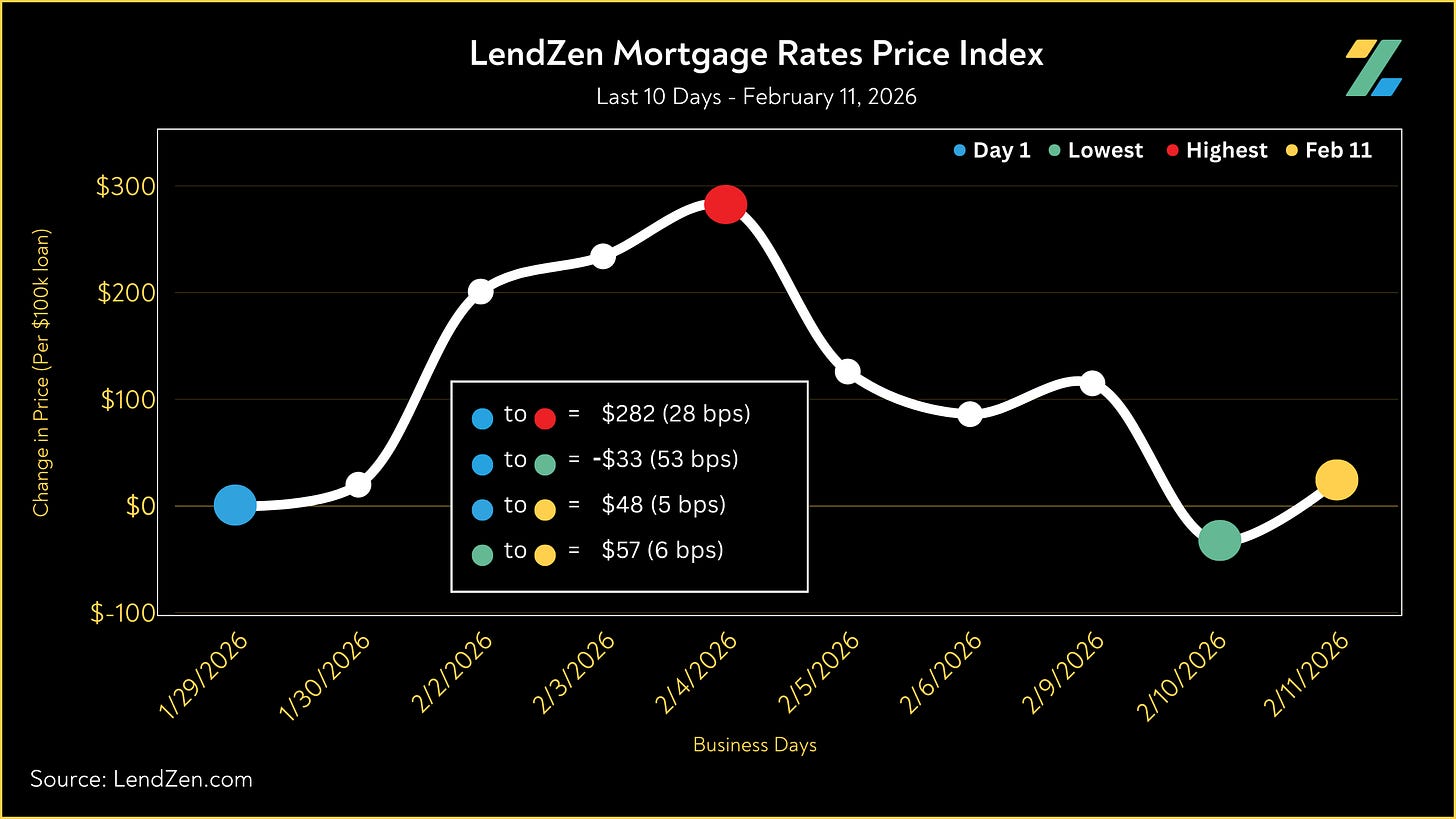 Since January 29, the price of mortgage rates increased 25 basis points, as seen in the 10-Day chart below.