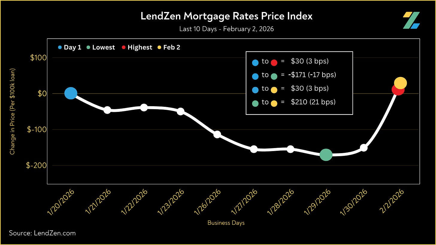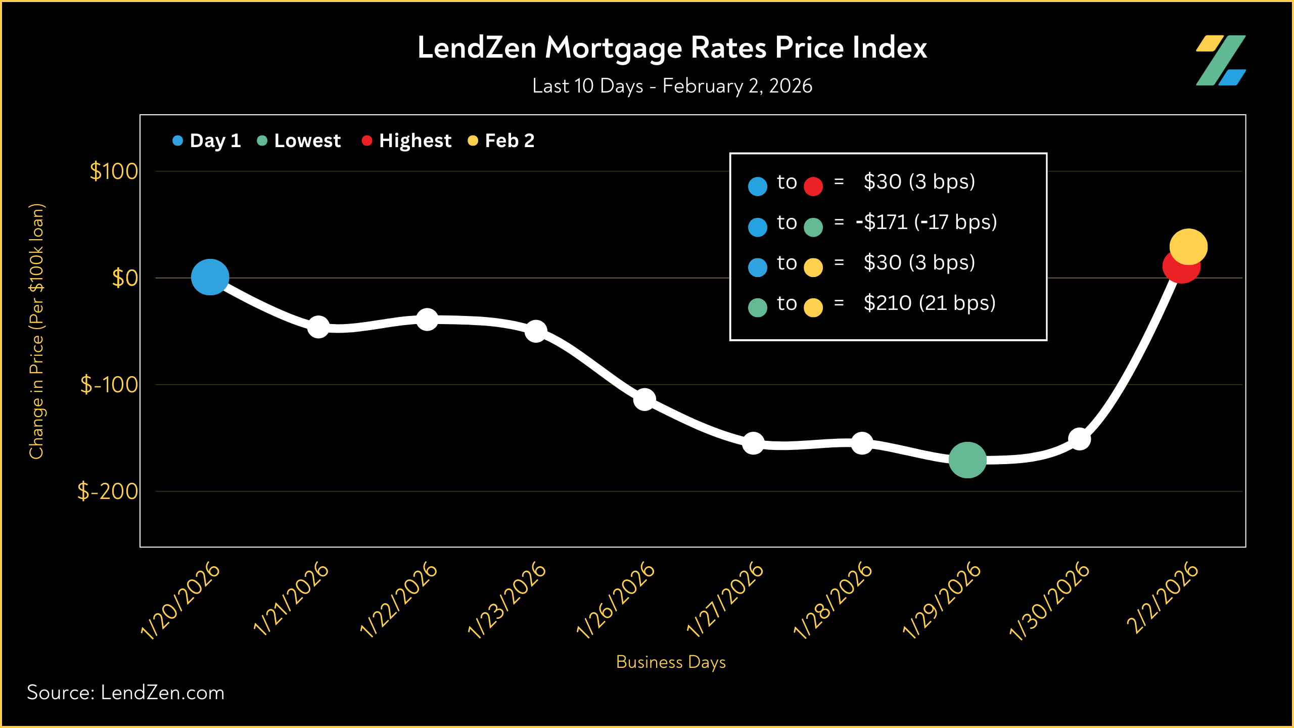 Since January 20, the price of mortgage rates increased 3 basis points, as seen in the 10-Day chart below.