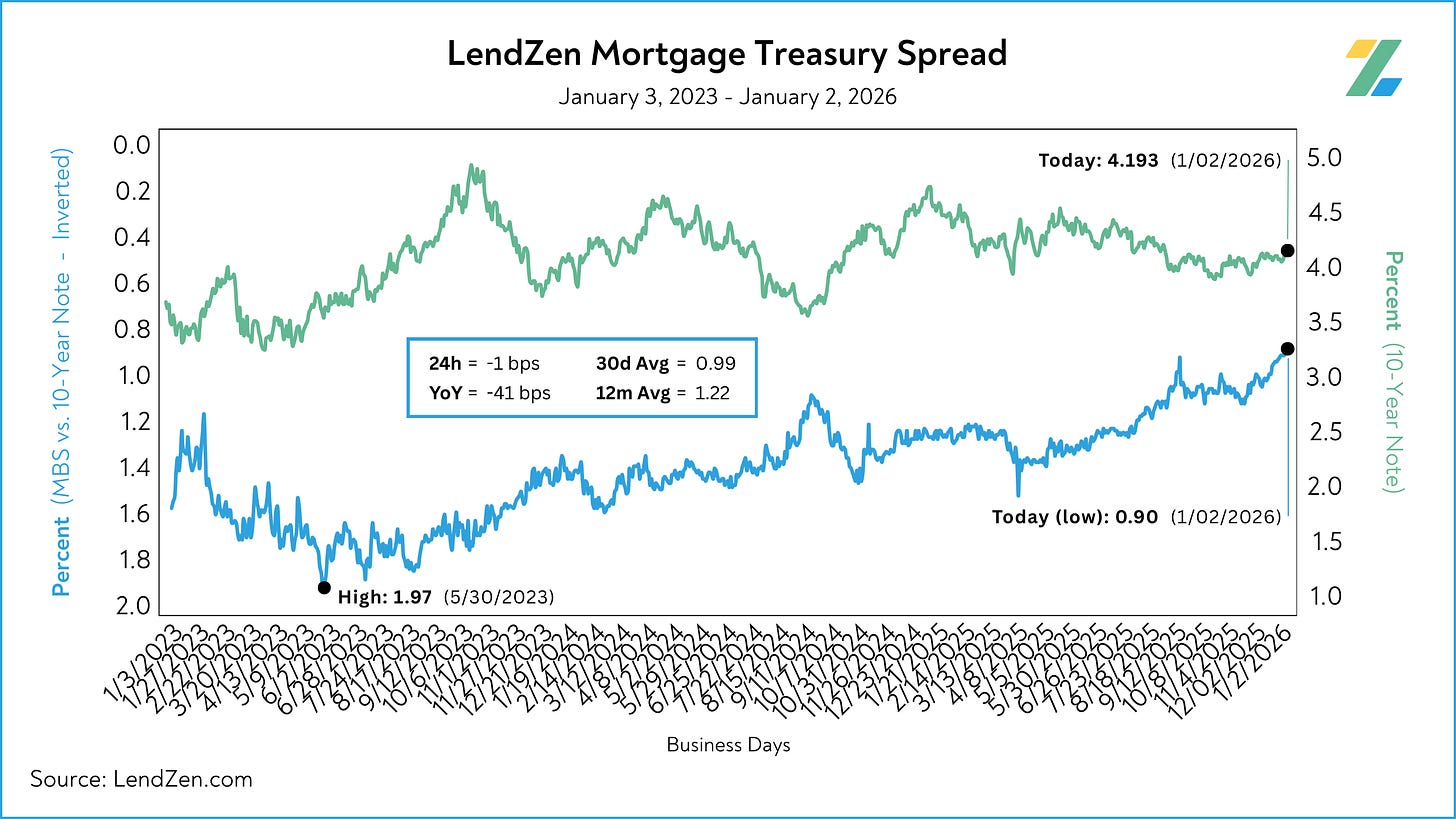 The LMTS charts below show the spread between mortgage-backed securities and the 10-Year U.S. Treasury Note tightened 1 bps today.