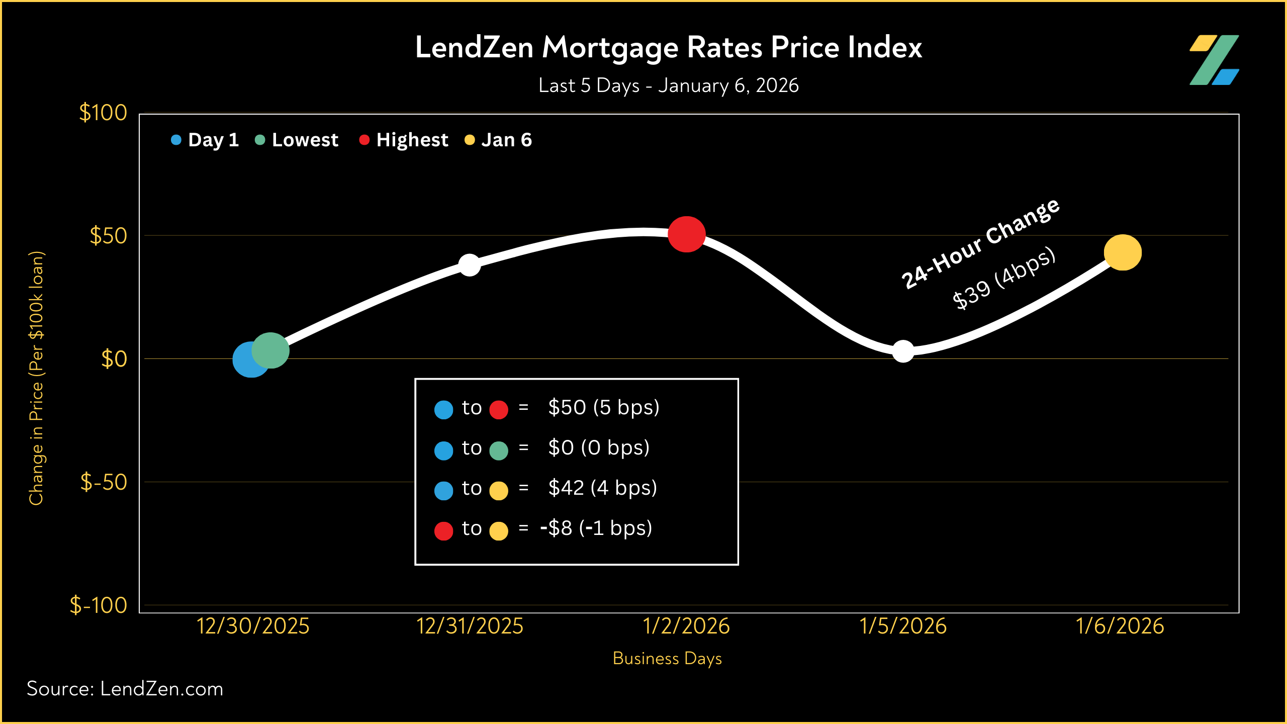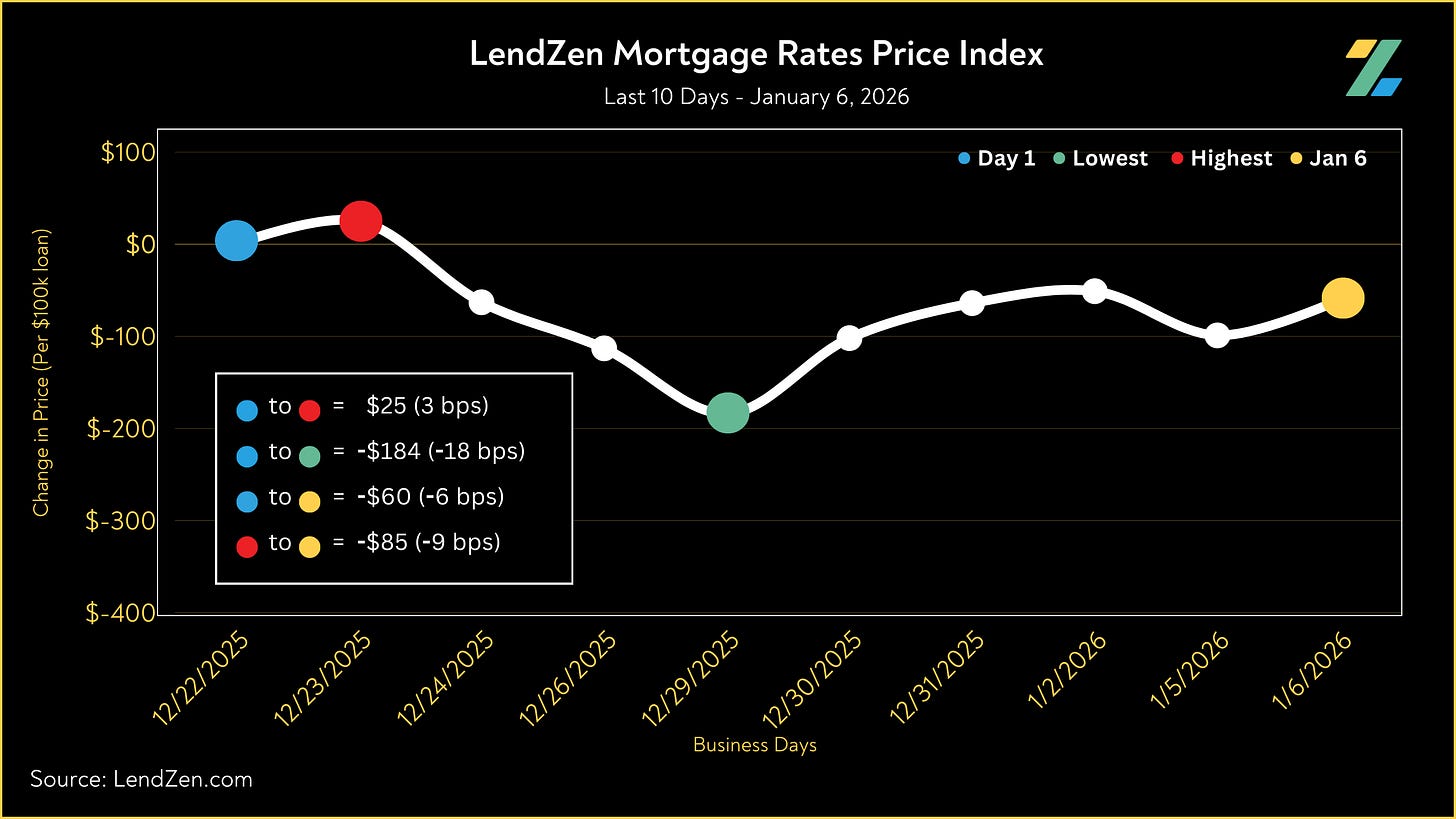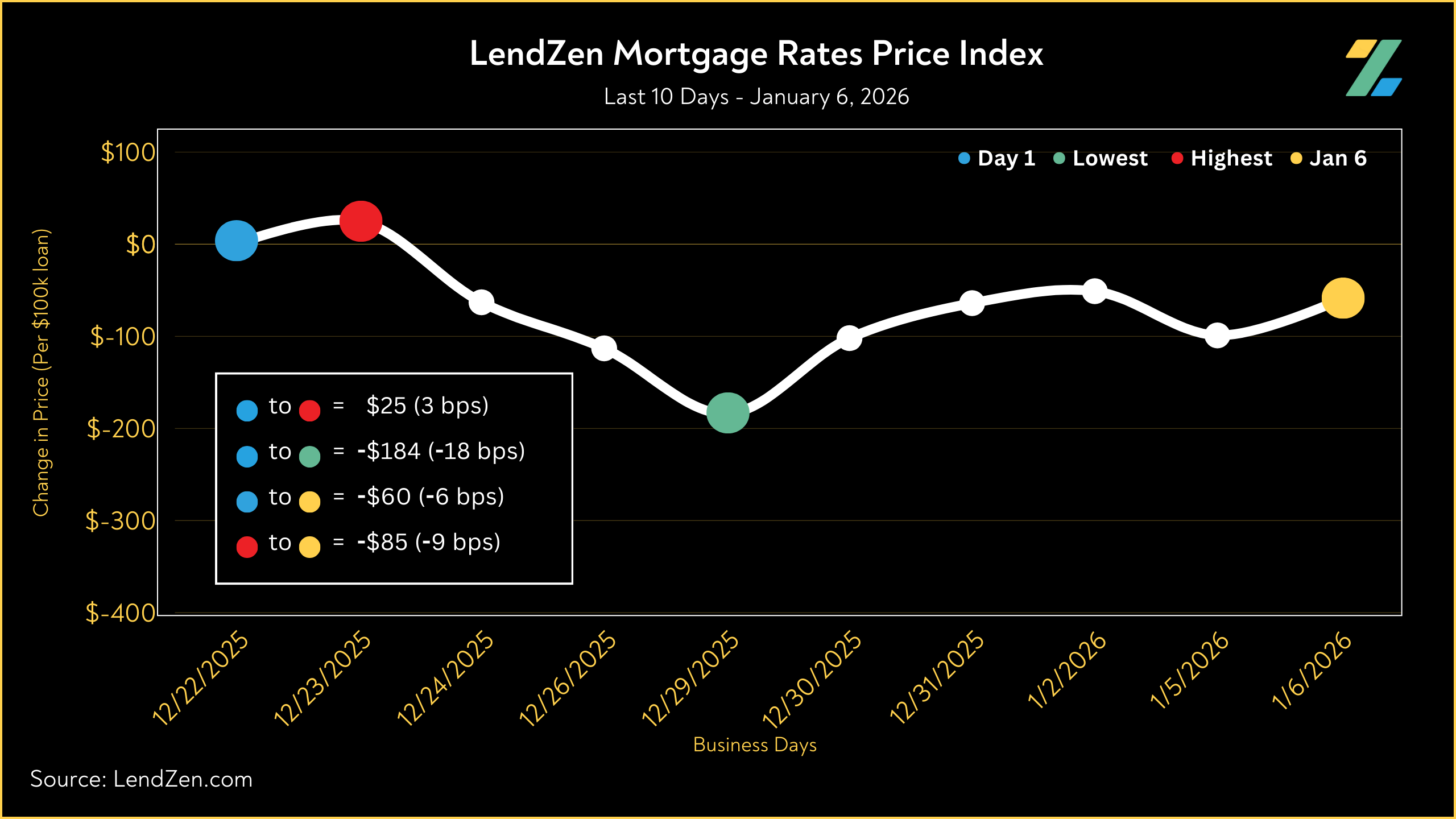 Since December 22, the price of mortgage rates decreased 6 basis points, as seen in the 10-Day chart below.