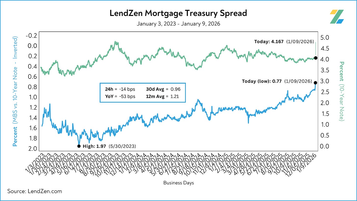 The LMTS charts below show the spread between mortgage-backed securities and the 10-Year U.S. Treasury Note tightened 14 bps today.