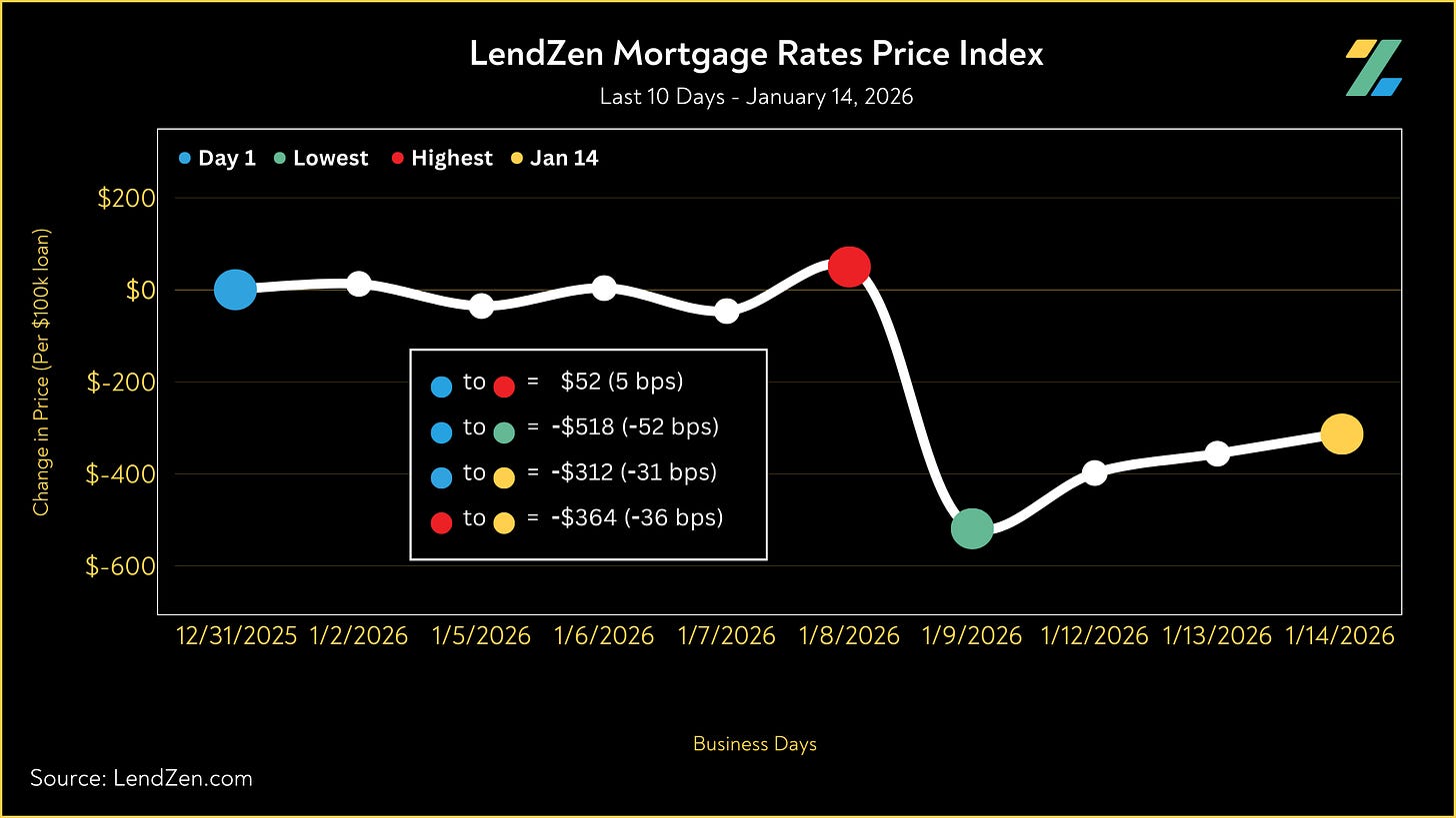 Since December 31, the price of mortgage rates decreased 31 basis points, as seen in the 10-Day chart below.