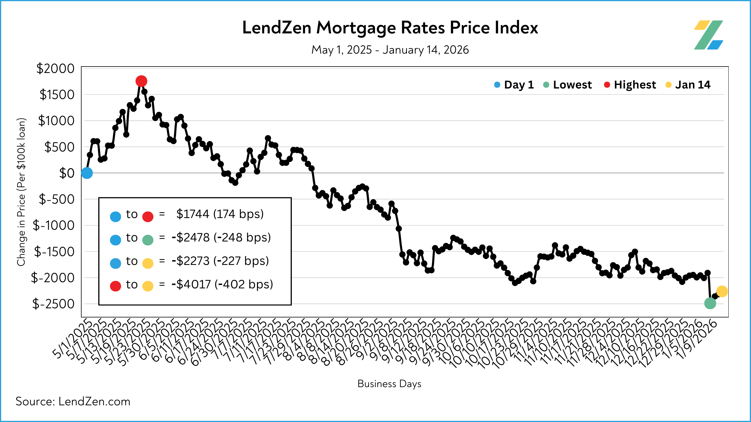 Since starting the index on May 1, 2025, mortgage rates are now 227 bps less expensive.