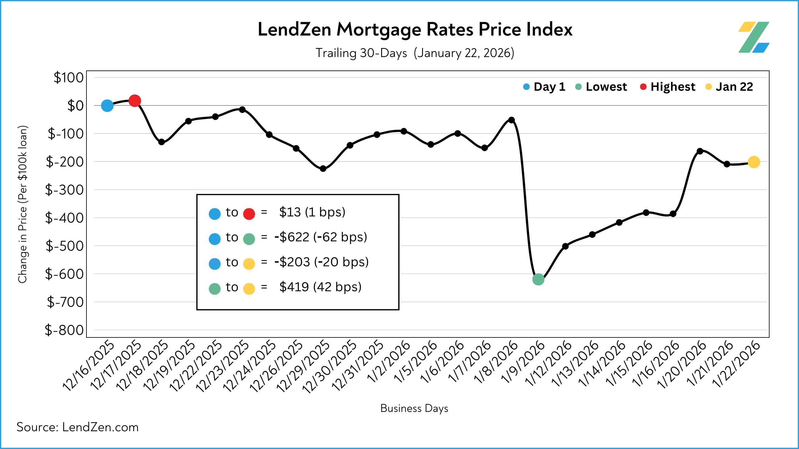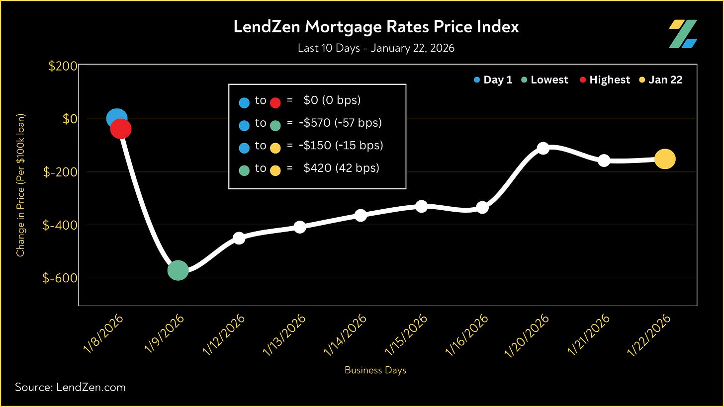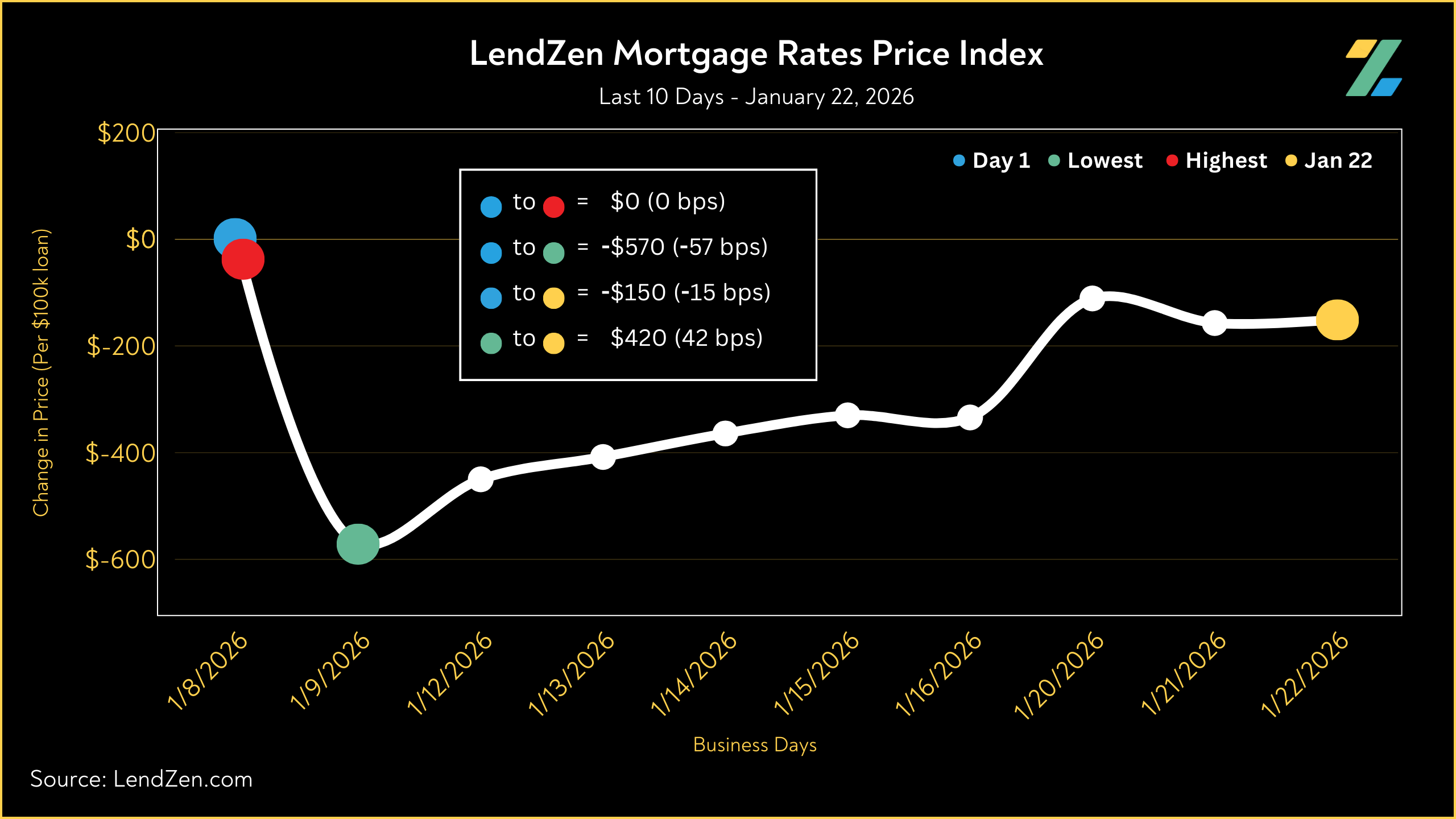 Since January 8, the price of mortgage rates decreased 15 basis points, as seen in the 10-Day chart below.