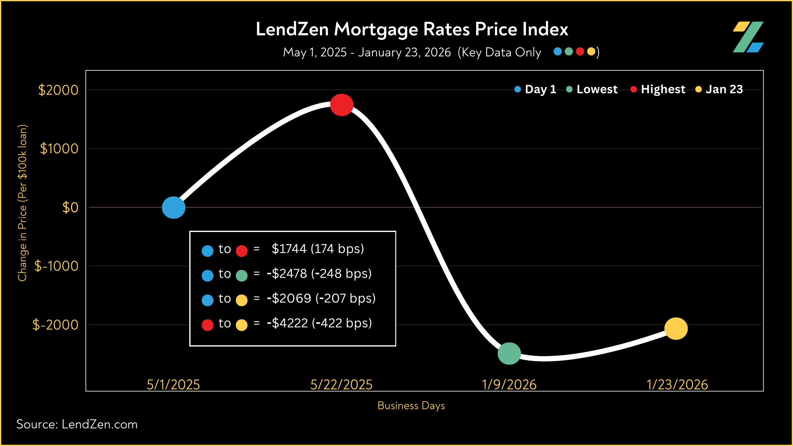 Meanwhile, the LendZen Index tracks the price of each mortgage rate across a spectrum of publicly traded MBS.