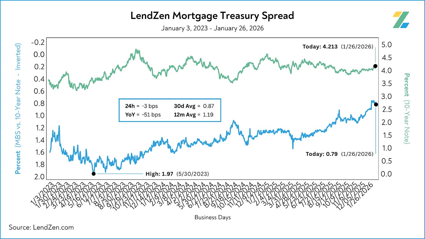 The LMTS charts below show the spread between mortgage-backed securities and the 10-Year U.S. Treasury Note tightened 3 bps today.