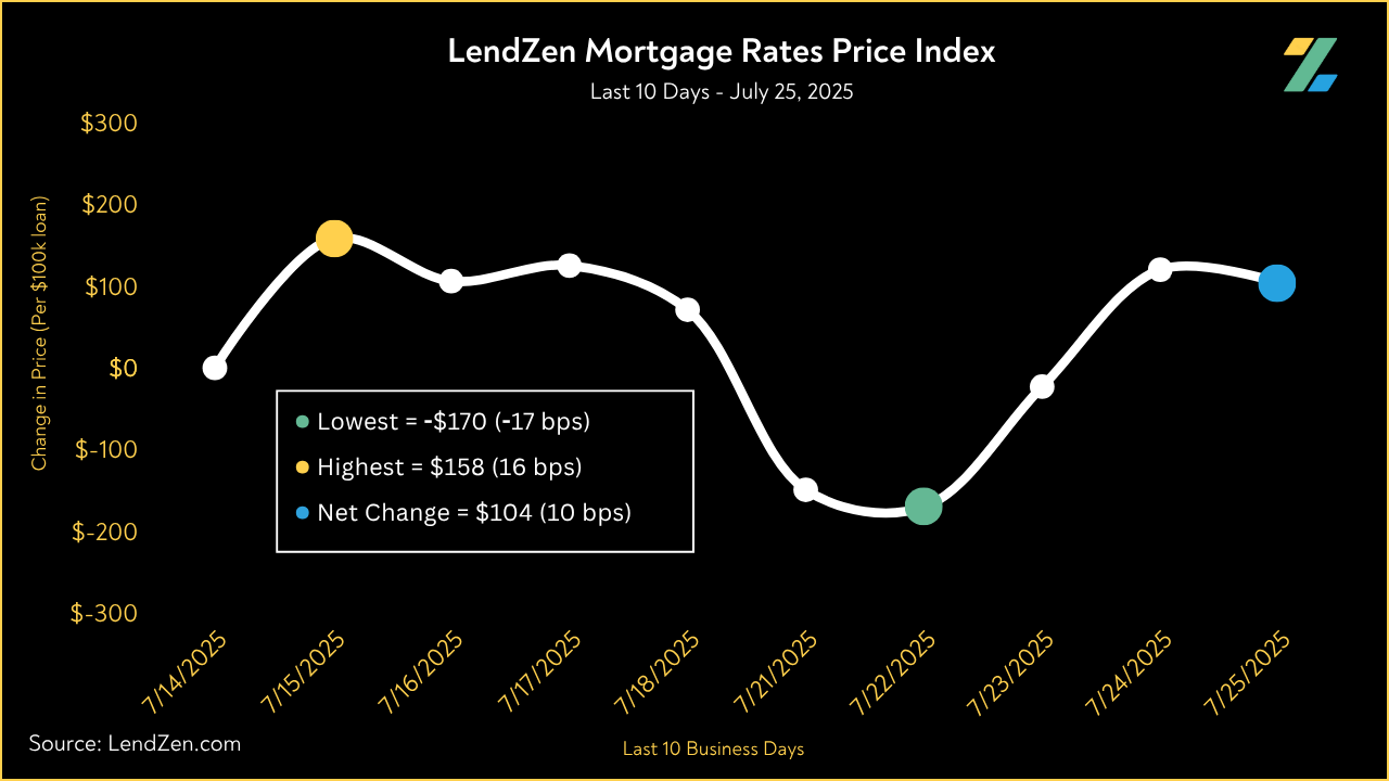 Since July 14, the price of mortgage rates increased 10 basis points, as seen in the 10-Day chart below.