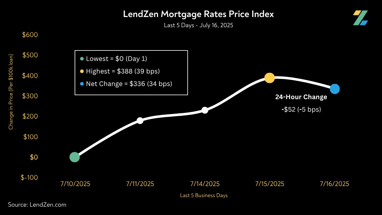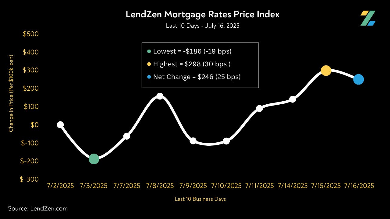 Since July 2, the price of mortgage rates increased 25 basis points, as seen in the 10-Day chart below.