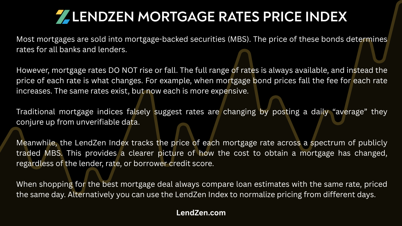 The LendZen Index tracks the price of mortgage rates across a spectrum of mortgage-backed securities.