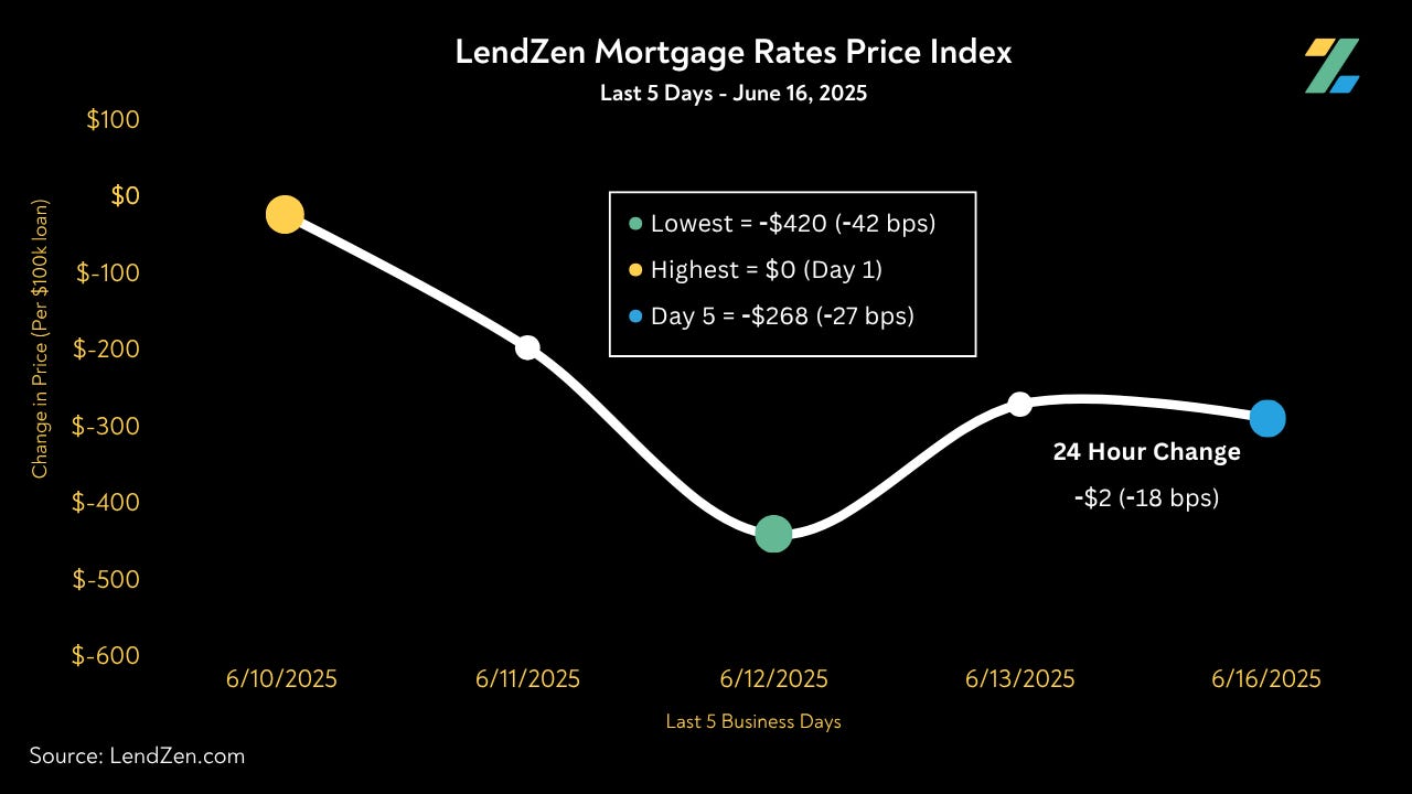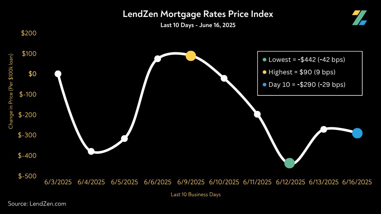 The LendZen Index tracks the change in mortgage rate prices across a spectrum of mortgage bonds.
