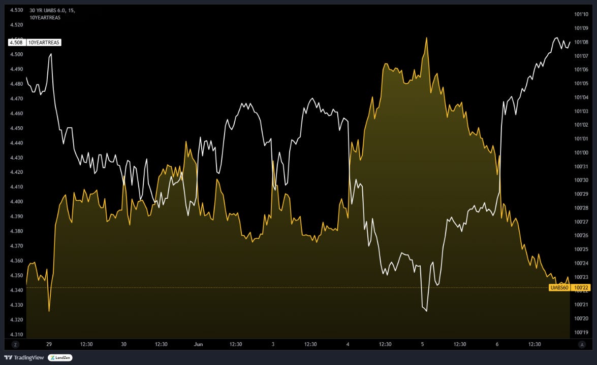 This is why the RATE of the 10-year Treasury Bond shows an almost perfectly inverse relationship to the PRICE of mortgage-backed securities.
