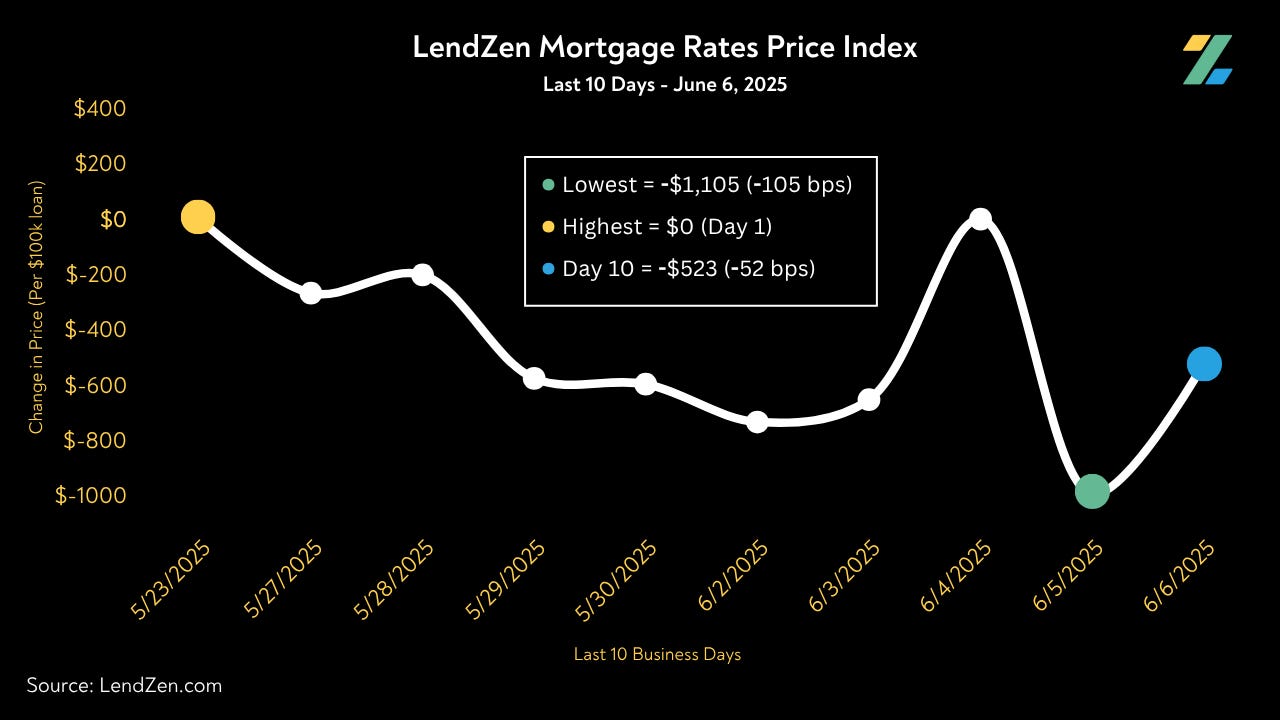 Unlike traditional average rate indices, which can be misleading due to their flawed composition, the LendZen Index tracks the change in mortgage rate PRICES across a spectrum of mortgage bonds.