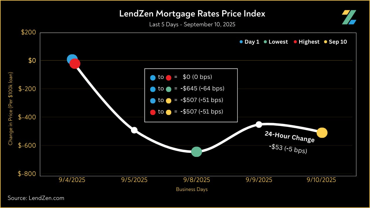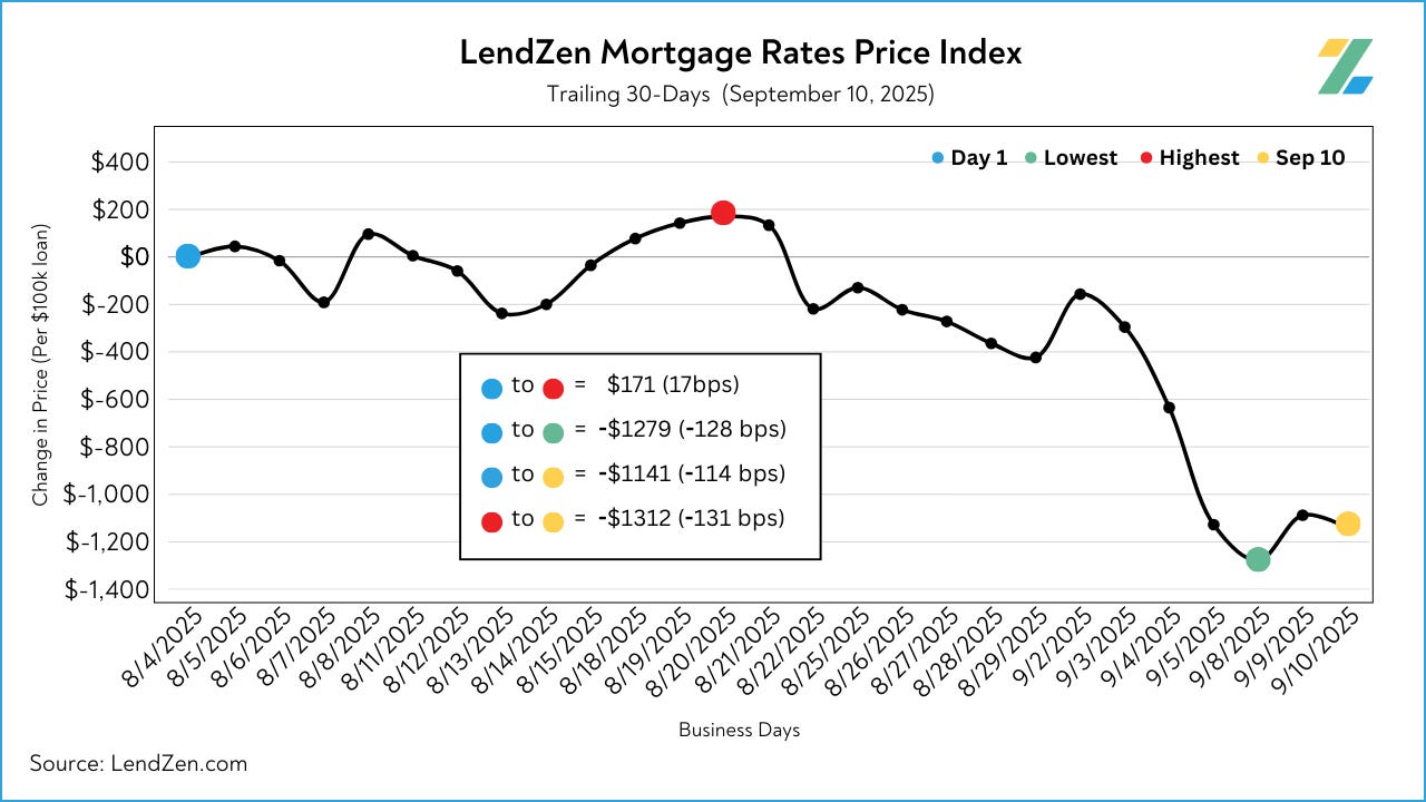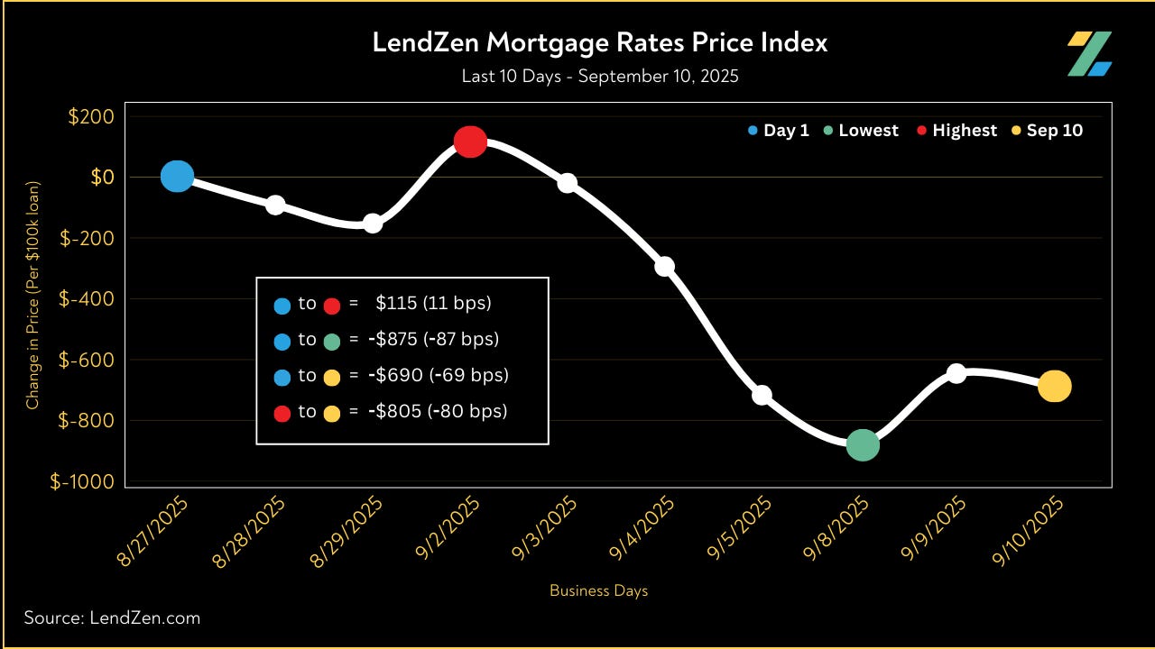 Since August 27, the price of mortgage rates decreased 69 basis points, as seen in the 10-Day chart below.