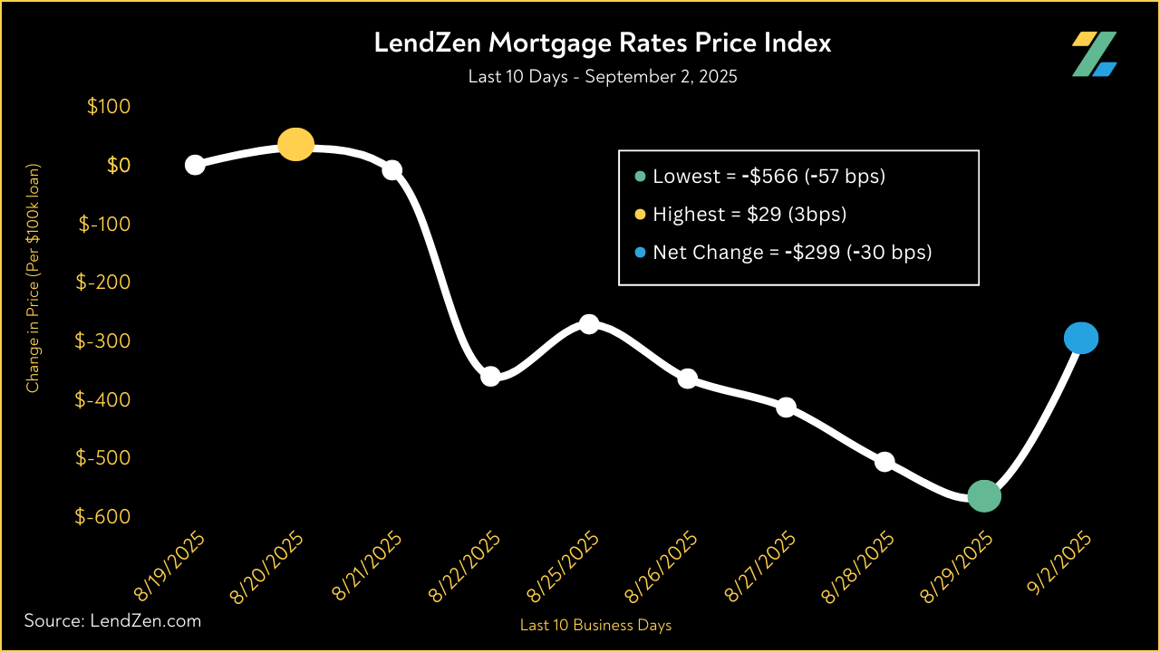 Since August 19, the price of mortgage rates decreased 30 basis points, as seen in the 10-Day chart below.