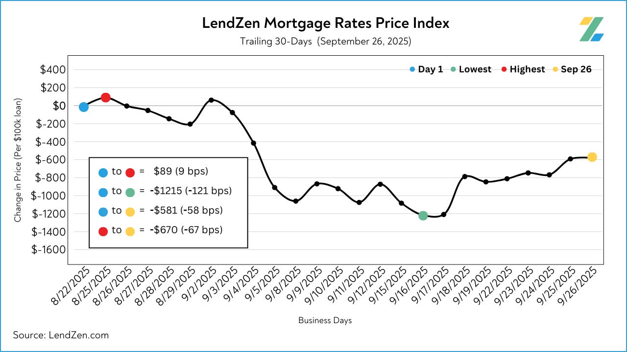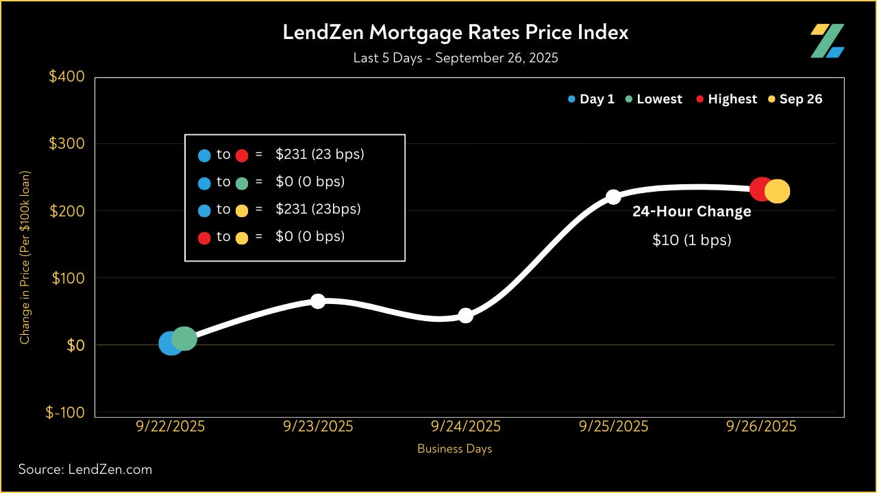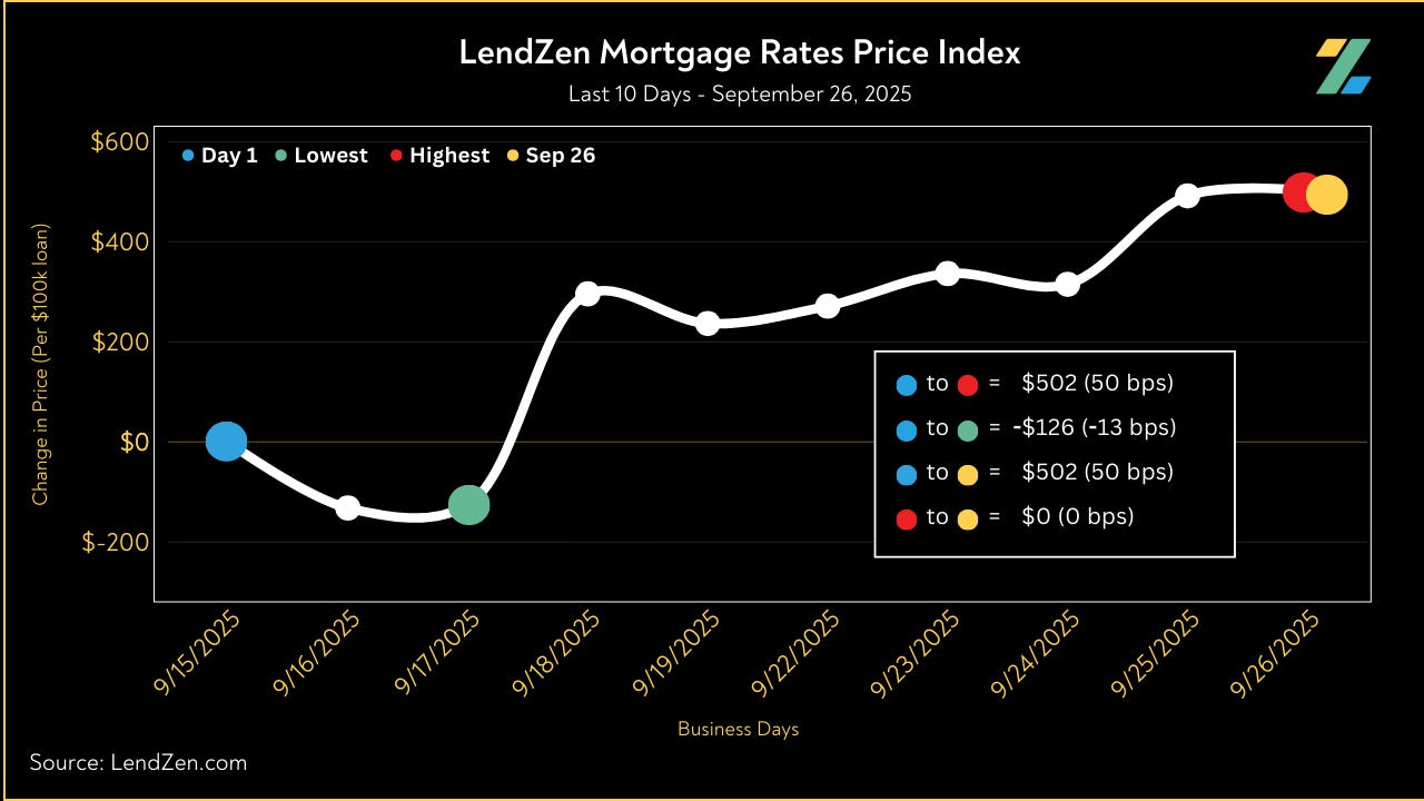 Since September 15, the price of mortgage rates increased 25 basis points, as seen in the 10-Day chart below.
