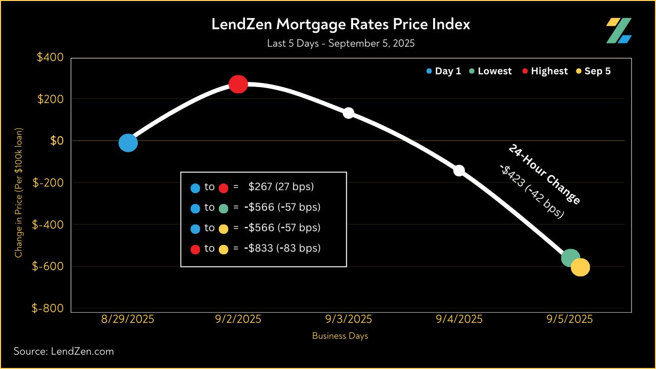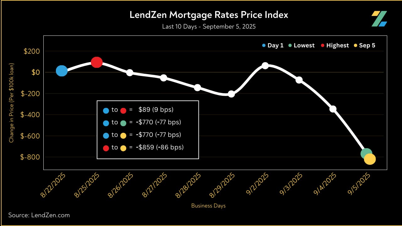 Since August 22, the price of mortgage rates decreased 77 basis points, as seen in the 10-Day chart below.