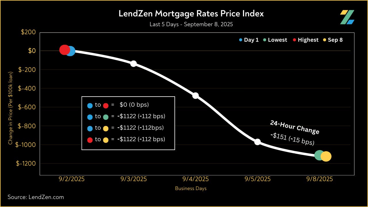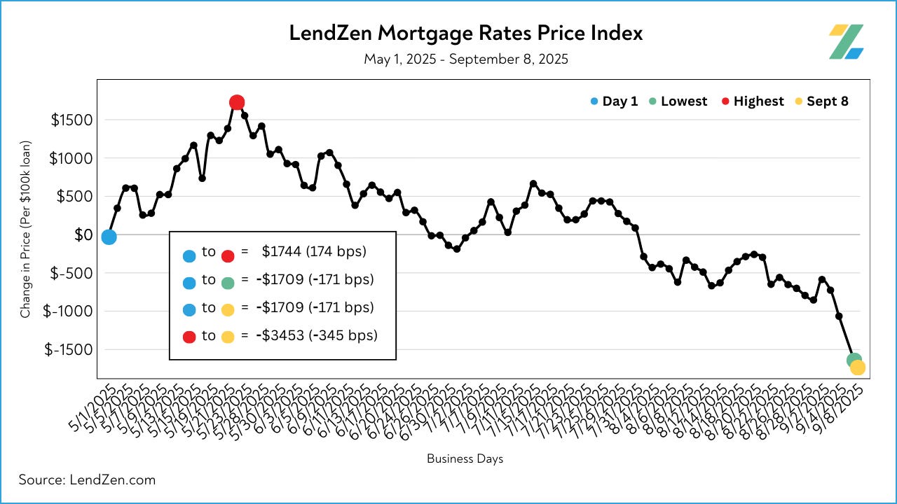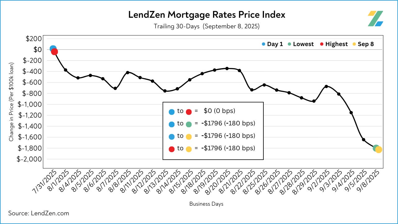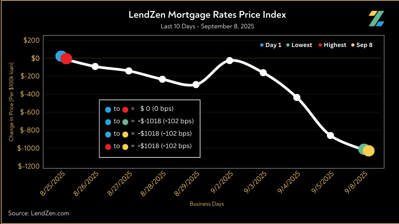 Since August 25, the price of mortgage rates decreased 102 basis points, as seen in the 10-Day chart below.